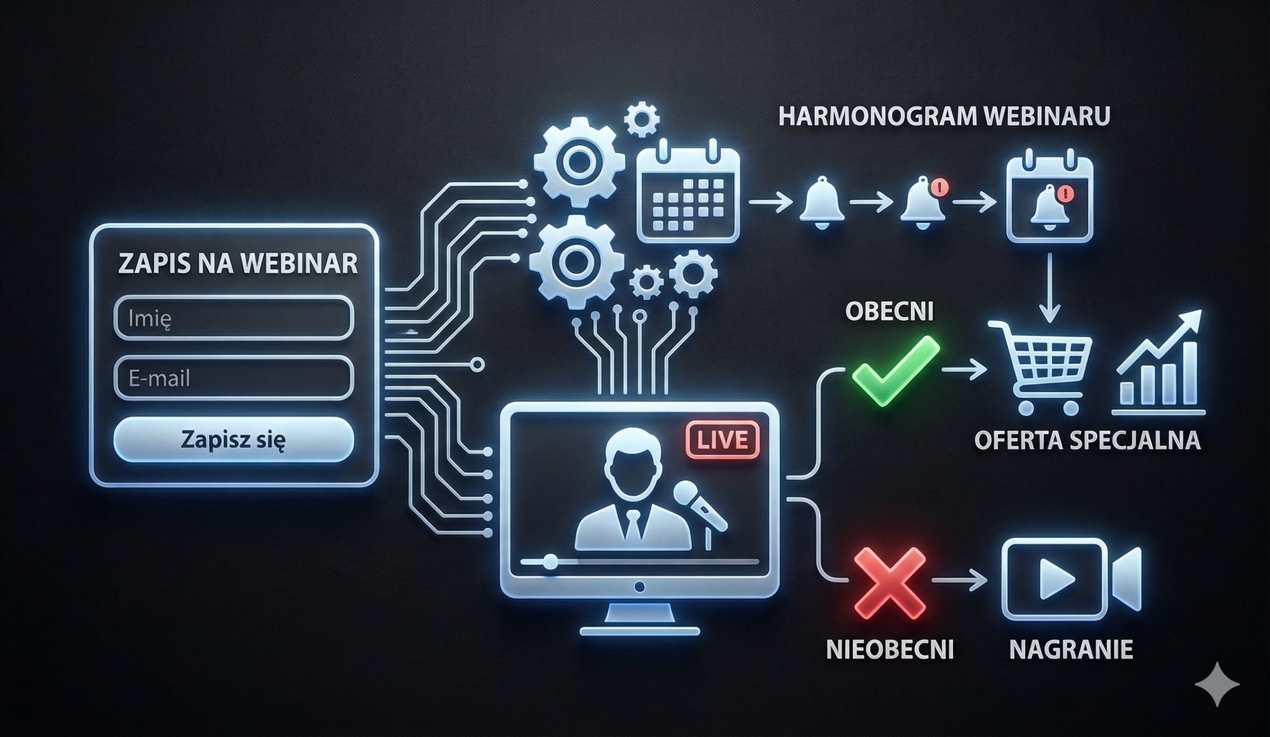 Ręczne zarządzanie uczestnikami i wysyłka przypomnień to logistyczny koszmar, który obniża frekwencję. System automatycznie przejmuje stery od momentu zapisu: wysyła spersonalizowane zaproszenia do kalendarza oraz wielokanałowe przypomnienia (E-mail/WhatsApp). Po wydarzeniu inteligentnie segmentuje listę na osoby obecne i nieobecne, serwując im dopasowane oferty. Ty skupiasz się na wystąpieniu, a automat dba o to, by sala była pełna, a sprzedaż po evencie – zmaksymalizowana.